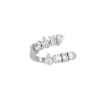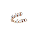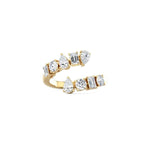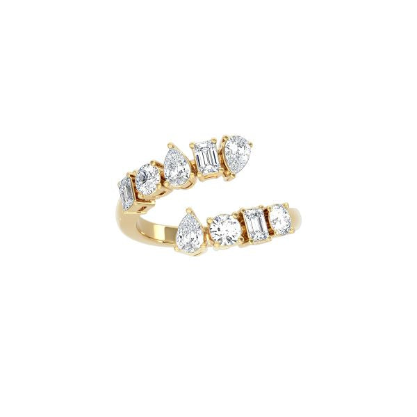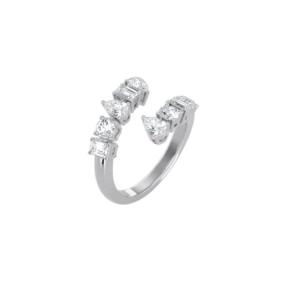 With its twist design, this open ring accentuates a mélange of diamonds. It features pear shape, round brilliant and emerald cut diamonds that sparkle at every angle.