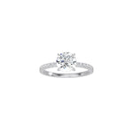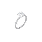 Sophisticated and modern, engagement ring features a round brilliant cut diamond in a 4-prong setting. The pavé setting band compliments the brilliance of the center stone that brings timeless glamour to this engagement ring.