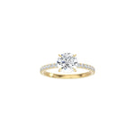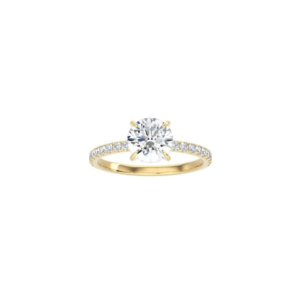 Sophisticated and modern, engagement ring features a round brilliant cut diamond in a 4-prong setting. The pavé setting band compliments the brilliance of the center stone that brings timeless glamour to this engagement ring.