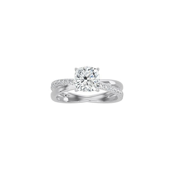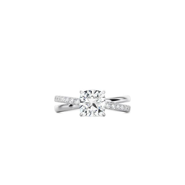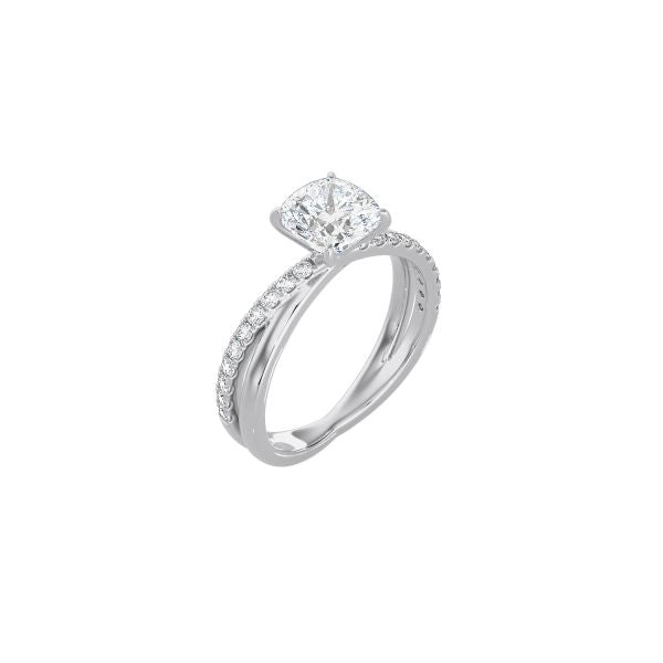 Luxury is in the details in this minimalist yet eye-catching style. The plain and pavé cross band perfectly complements the cushion cut diamond solitaire in the elegant Cushion Cut Diamond and Gold Cross Band engagement ring.