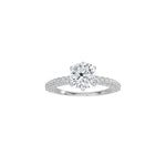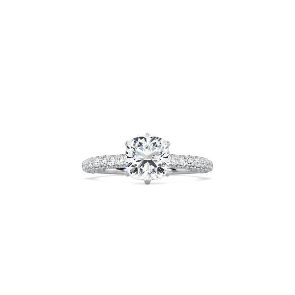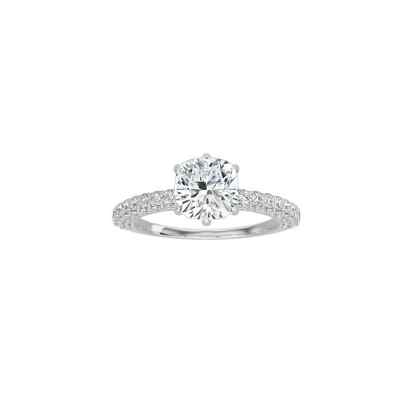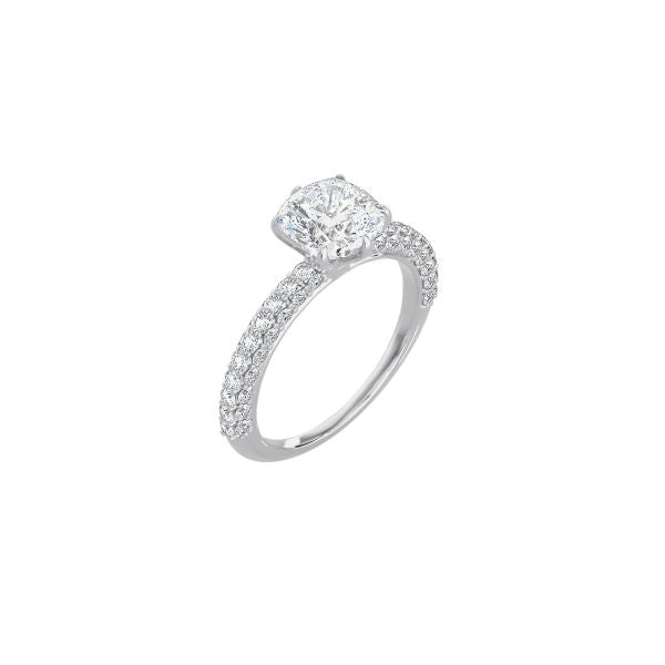 The Triple Row Pavé Band is an enduring symbol of love. Three rows of pavé diamonds adorn the band with a cushion cut diamond at the center.