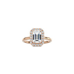 The Halo Engagement Ring celebrates the center diamond with radiant, delicate diamonds that encompass it. It features an emerald cut diamond with a halo of round diamonds on a plain band.