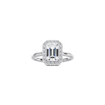The Halo Engagement Ring celebrates the center diamond with radiant, delicate diamonds that encompass it. It features an emerald cut diamond with a halo of round diamonds on a plain band.