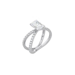 The Emerald Cut X Pavé Band Ring incorporates a perfect mix of vintage and contemporary, melded together to create an eye-catching design. It features an emerald cut diamond that sits at the center of an X-shaped pavé band studded with smaller diamonds.