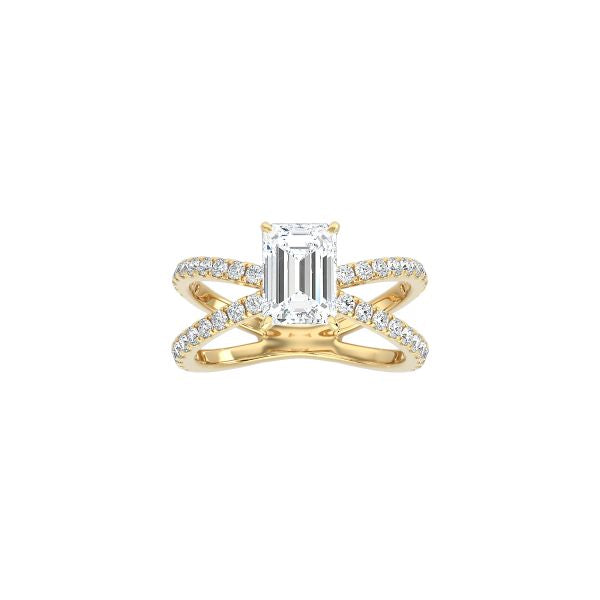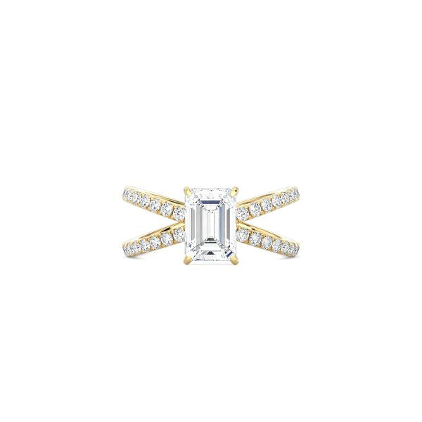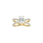 The Emerald Cut X Pavé Band Ring incorporates a perfect mix of vintage and contemporary, melded together to create an eye-catching design. It features an emerald cut diamond that sits at the center of an X-shaped pavé band studded with smaller diamonds.