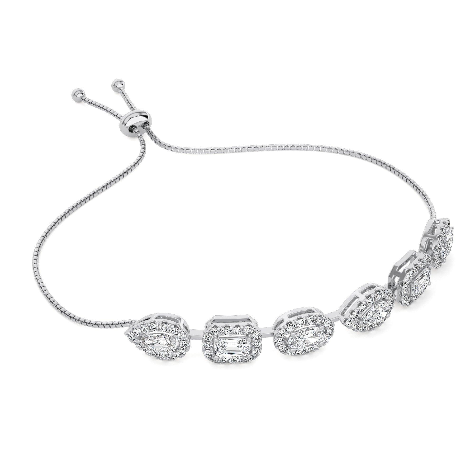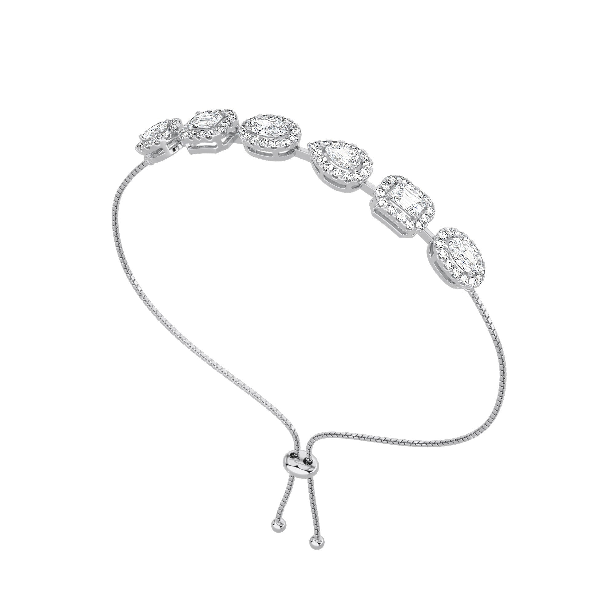 Eye-catching Oval and Emerald stones set on halos are linked together with an adjustable chain for comfort and beauty.