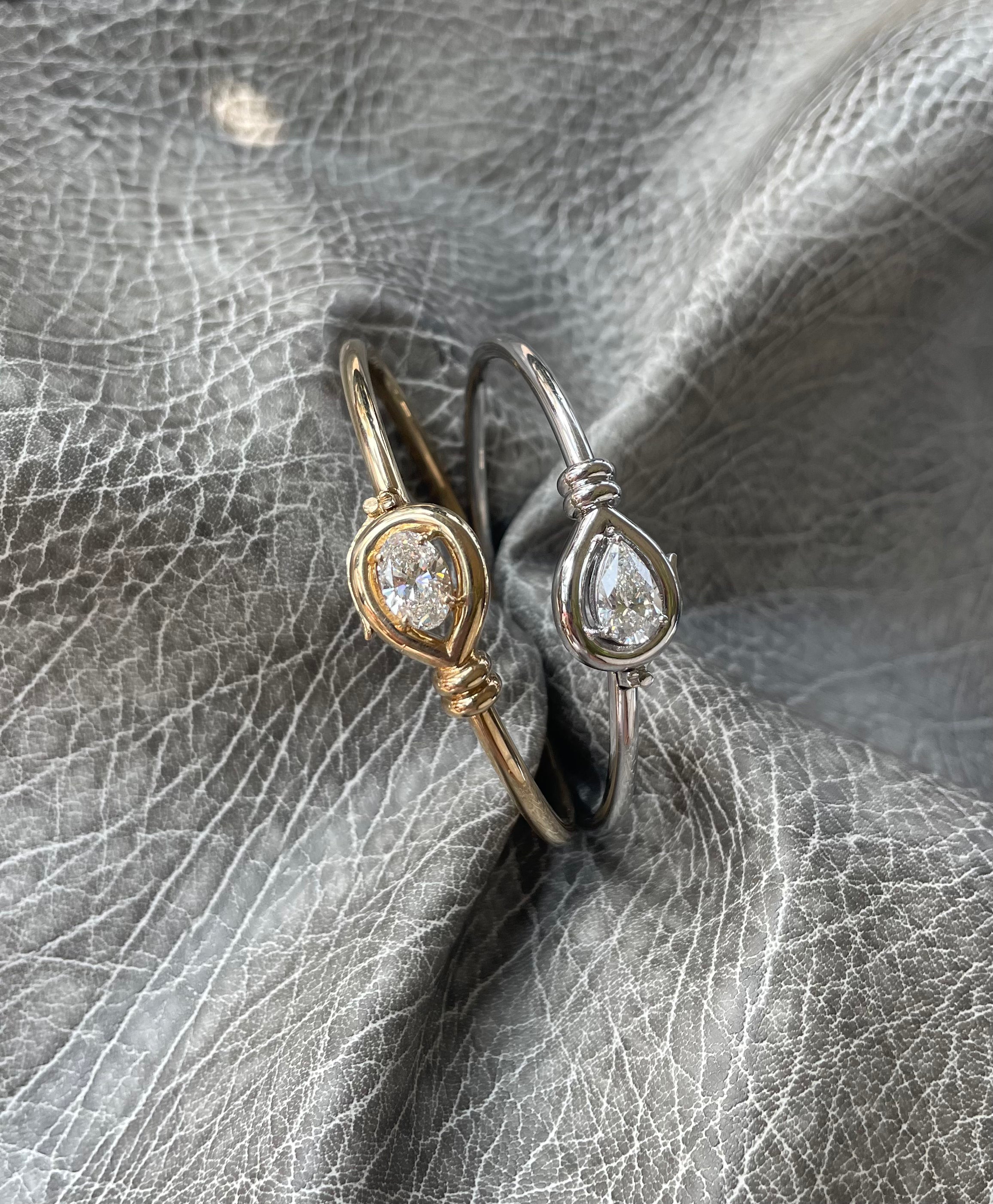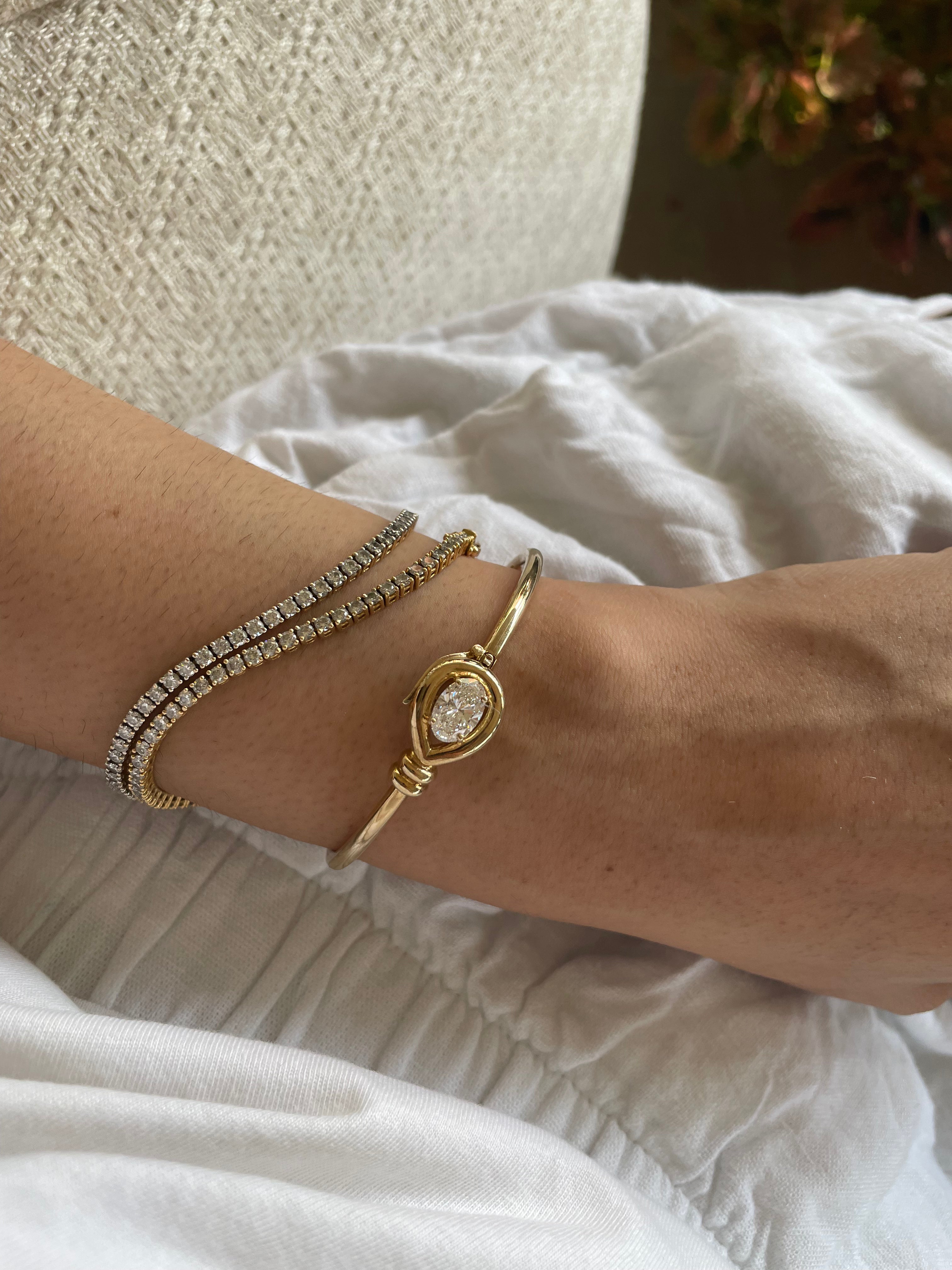 This openable bangle features 1.54 carats IGI certified solitaire diamonds of E-F color and VVS+ purity. Available in Yellow Gold and White gold. Approximately 17 grams of 9KT gold. The perfect companion for everyday stacks.