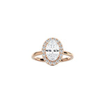 The Halo Engagement Ring celebrates the center diamond with radiant, delicate diamonds that encompass it. It features a cushion cut diamond with a halo of round diamonds on a plain band.