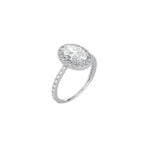 The Halo Engagement Ring celebrates your center diamond with radiant, delicate diamonds that encompass it. It features an oval diamond with a halo of round diamonds on a pavé band which gives this ring maximum sparkle.