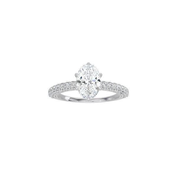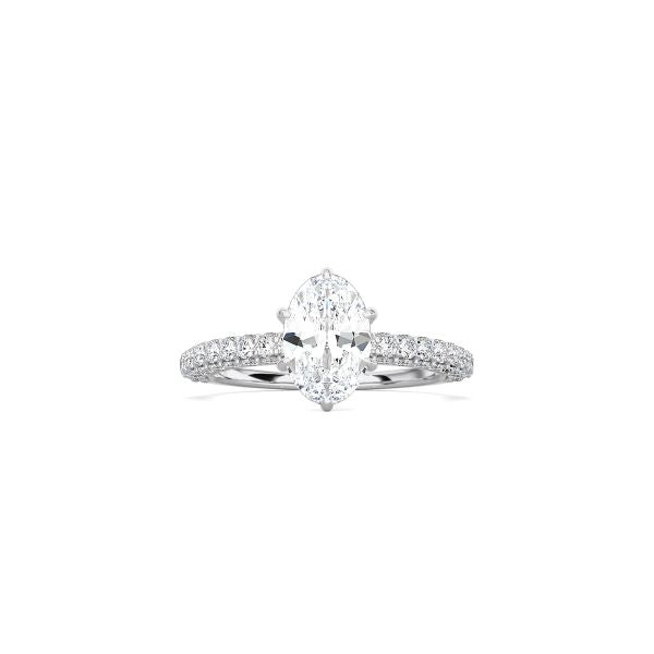 The Triple Row Pavé Band is an enduring symbol of love. Three rows of pavé diamonds adorn the band with an oval cut diamond at the center.