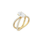 The Oval Cut X Pavé Band Ring incorporates a perfect mix of vintage and contemporary, melded together to create an eye-catching design. It features a cushion cut diamond that sits at the center of an X-shaped pavé band studded with smaller diamonds.
