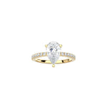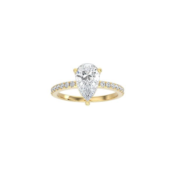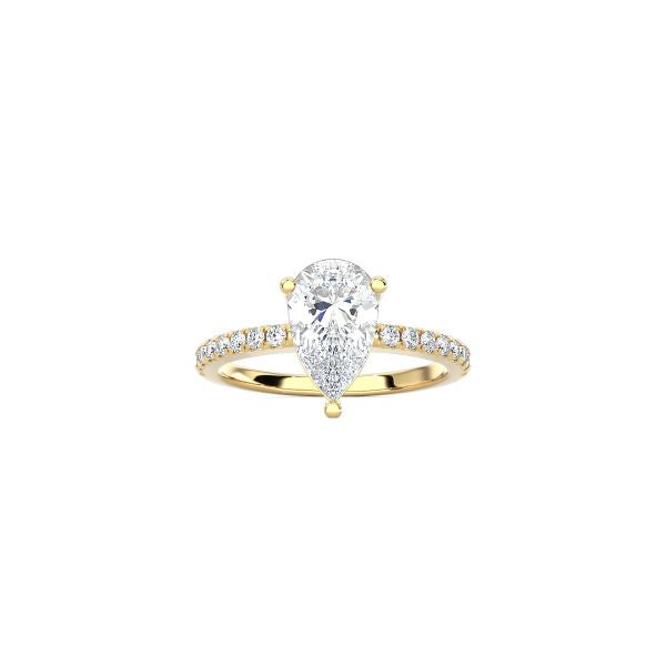 The Contemporary Four Prong Setting provides a modern flair to a classic four prong design. The simple design ensures the pear shape diamond to be center of attention, while a band of pave set diamonds to compliment the design.