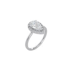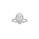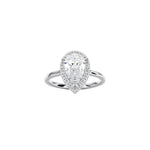 The Halo Engagement Ring celebrates the center diamond with radiant, delicate diamonds that encompass it. It features a pear shape diamond with a halo of round diamonds on a plain band.