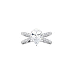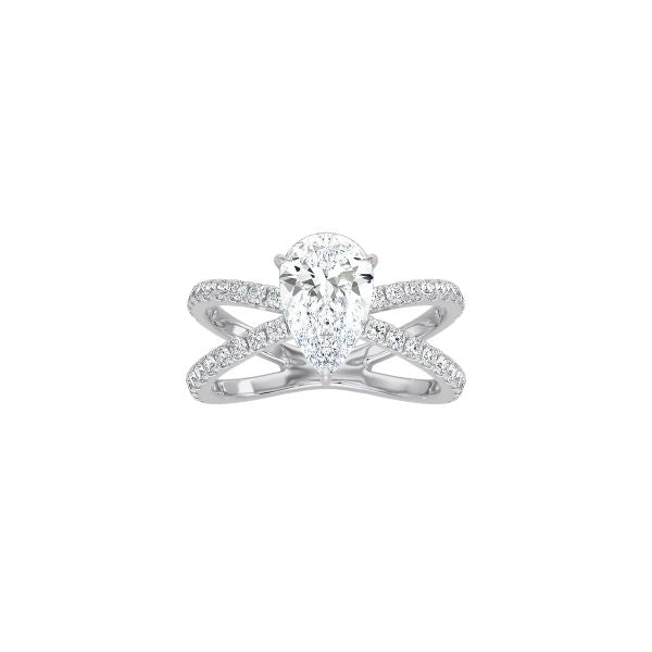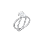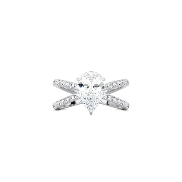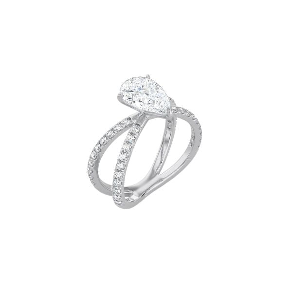 The Pear Shape X Pavé Band Ring incorporates a perfect mix of vintage and contemporary, melded together to create an eye-catching design. It features a pear shape diamond that sits at the center of an X-shaped pavé band studded with smaller diamonds.
