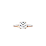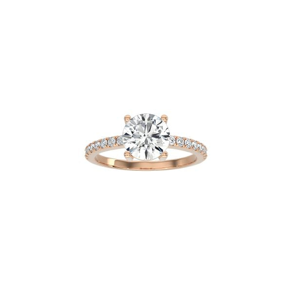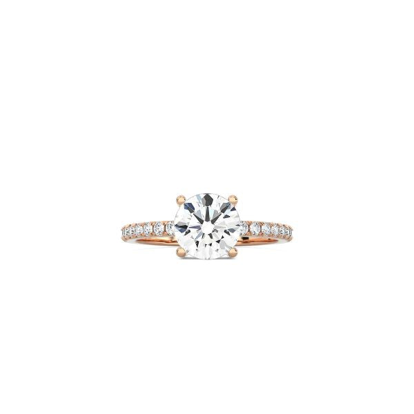 The Contemporary Four Prong Setting provides a modern flair to a classic four prong design. The simple design ensures the round brilliant diamond to be center of attention, while a band of pave set diamonds to compliment the design.