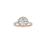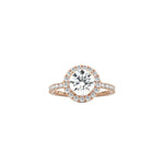 The Halo Engagement Ring celebrates your center diamond with a circle of radiant, delicate diamonds that encompass it. It features a round brilliant cut diamond with a halo of round diamonds on a pavé band which gives this ring maximum sparkle.