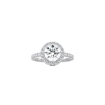 The Halo Engagement Ring celebrates your center diamond with a circle of radiant, delicate diamonds that encompass it. It features a round brilliant cut diamond with a halo of round diamonds on a pavé band which gives this ring maximum sparkle.