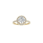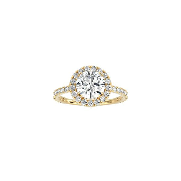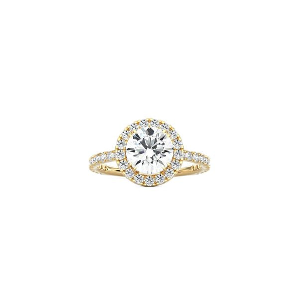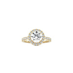 The Halo Engagement Ring celebrates your center diamond with a circle of radiant, delicate diamonds that encompass it. It features a round brilliant cut diamond with a halo of round diamonds on a pavé band which gives this ring maximum sparkle.