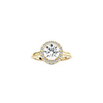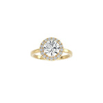The Halo Engagement Ring celebrates the center diamond with a circle of radiant, delicate diamonds that encompass it. It features a round brilliant cut diamond with a halo of round diamonds on a plain band.