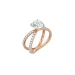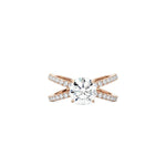 The Round X Pavé Band Ring incorporates a perfect mix of vintage and contemporary, melded together to create an eye-catching design. It features a round brilliant cut diamond that sits at the center of an X-shaped pavé band studded with smaller diamonds.