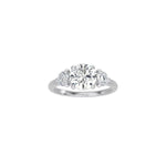 Rich in symbolism and style, the 3 Stone Engagement Ring celebrates your past, present and future together. Two exquisite accent stones flank the center round brilliant cut diamond on a plain band. The sparkle and brillance of the trio of diamonds make this ring one of the most glamourous engagment rings.