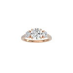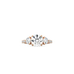 Rich in symbolism and style, the 3 Stone Engagement Ring celebrates your past, present and future together. Two exquisite accent stones flank the center round brilliant cut diamond on a pavé band. The sparkle and brillance of the trio of diamonds make this ring one of the most glamourous engagment rings.