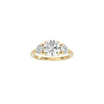 Rich in symbolism and style, the 3 Stone Engagement Ring celebrates your past, present and future together. Two exquisite accent stones flank the center round brilliant cut diamond on a plain band. The sparkle and brillance of the trio of diamonds make this ring one of the most glamourous engagment rings.